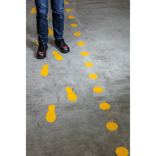 Segnaletica da pavimento sagomata a forma di “orme”, progettata per identificare aree pericolose, zone di stoccaggio e passaggi pedonali in ambienti interni. Realizzata con adesivo durevole, è altamente resistente alle abrasioni e garantisce una superficie antiscivolo certificata R9 secondo la normativa DIN 51130. Colore giallo segnale RAL 1003. Misure: 90 x 240 mm, spessore 0,7 mm.
