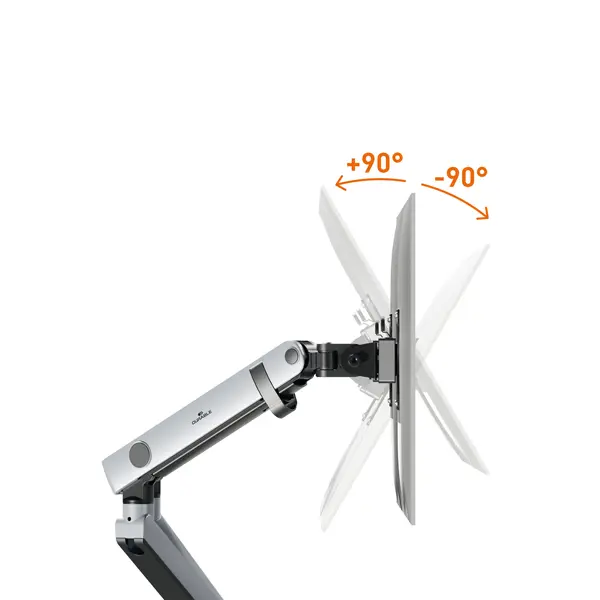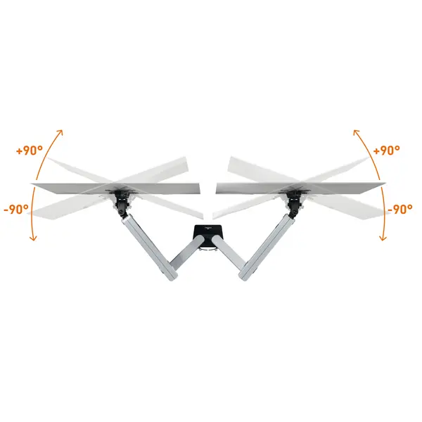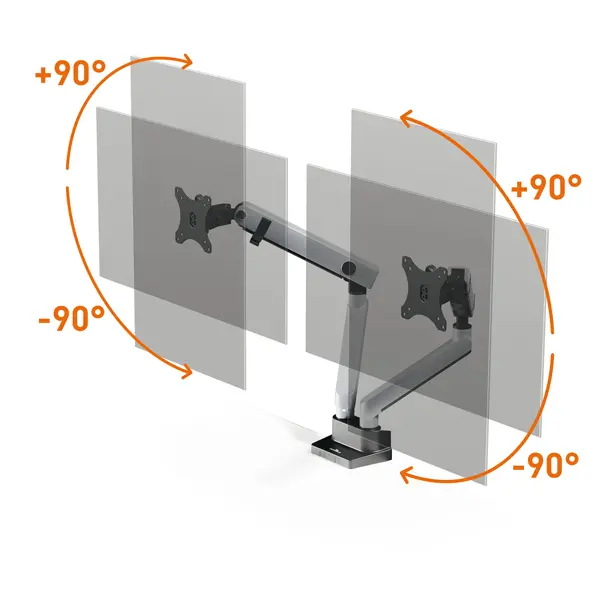 Una caratteristica versatile di questo braccio è la possibilità di ruotare i monitor di 90 gradi, consentendo di lavorare sia in modalità verticale che orizzontale con un meccanismo di bloccaggio per mantenere la posizione desiderata. Inoltre, i monitor possono essere direzionati di 180 gradi (+90°/-90°) e inclinati di 180 gradi (+90°/-90°), offrendo una gamma completa di opzioni di posizionamento.