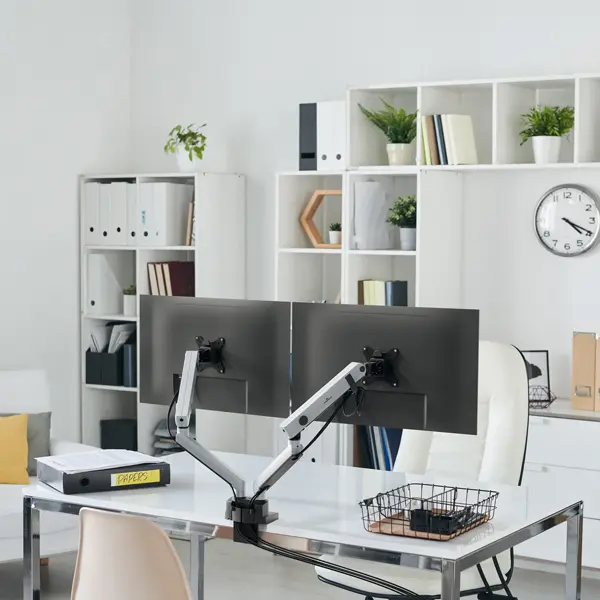Il supporto doppio per monitor è una soluzione avanzata progettata per ospitare due monitor standard fino a 32 pollici, con una capacità di peso massima di 8 kg per ciascun monitor. Dotato di opzioni di fissaggio tramite morsetto o perno per foro passacavo, entrambi inclusi nella confezione, offre una flessibilità di installazione adatta a diverse configurazioni di scrivania.
