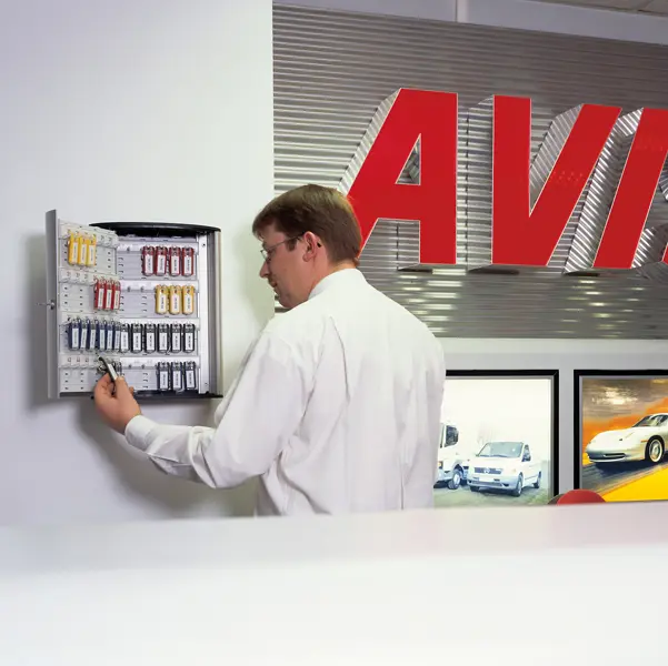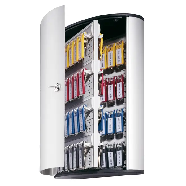 Cassetta portachiavi da muro in alluminio, con capacità di 72 chiavi. Lo sportello si apre oltre 90 gradi per un accesso comodo alle chiavi. Dotata di serratura e due chiavi numerate, facilmente sostituibili in caso di smarrimento o rottura. I pannelli interni consentono di agganciare le barre portachiavi all’altezza desiderata, offrendo una gestione altamente versatile. Include 6 portachiavi modello 1957 in colori assortiti. Dimensioni: 30,2 x 11,8 x 40 cm.