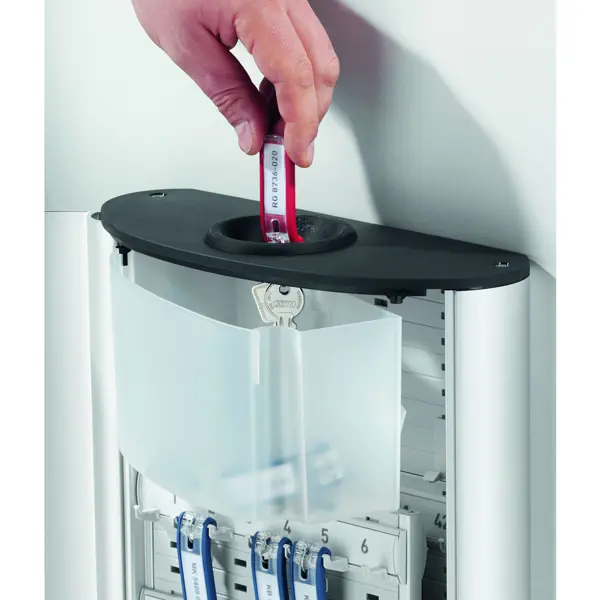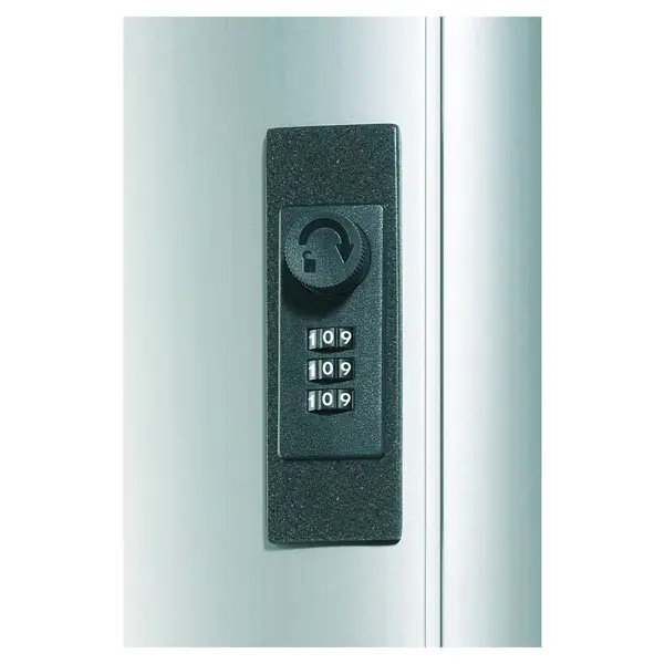 Cassetta portachiavi da muro con capacità di 54 chiavi, realizzata in alluminio e progettata per un rapido ritorno delle chiavi. Dotata di sportello con apertura di 90° per un accesso agevole, presenta una serratura a combinazione a tre cifre, selezionabile tra 1000 opzioni. Sulla parte superiore, è presente una fessura che consente di inserire le chiavi da restituire anche a cassetta chiusa; le chiavi cadono in una vaschetta interna, rimanendo al sicuro fino all’apertura successiva. Include 6 portachiavi modello 1957. Dimensioni: 30,2 x 40 x 11,8 cm.