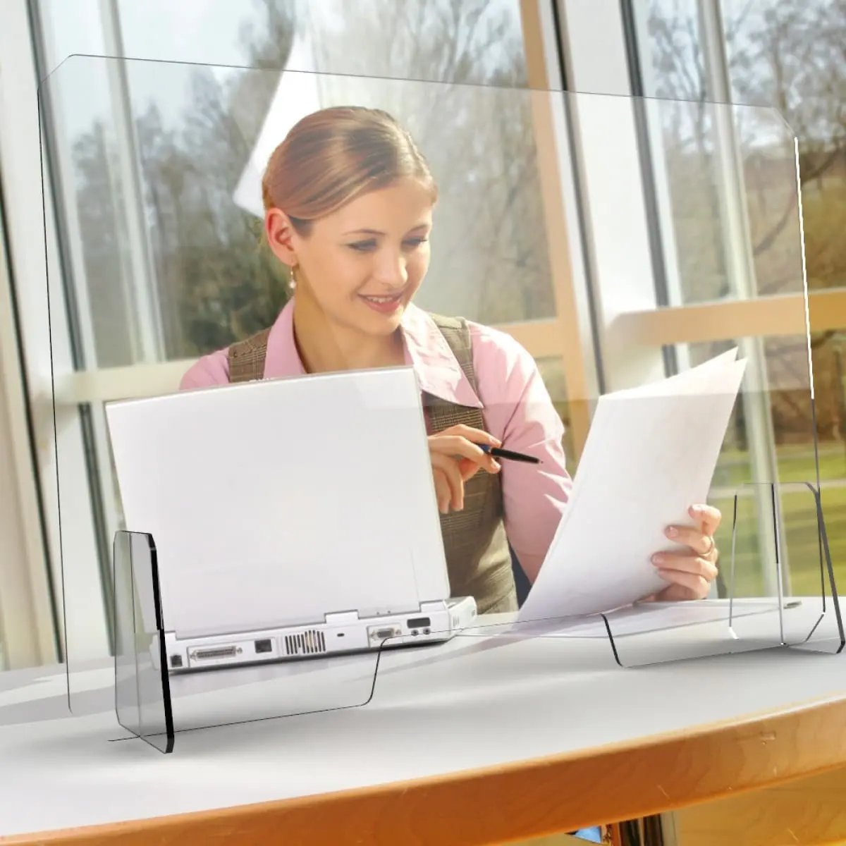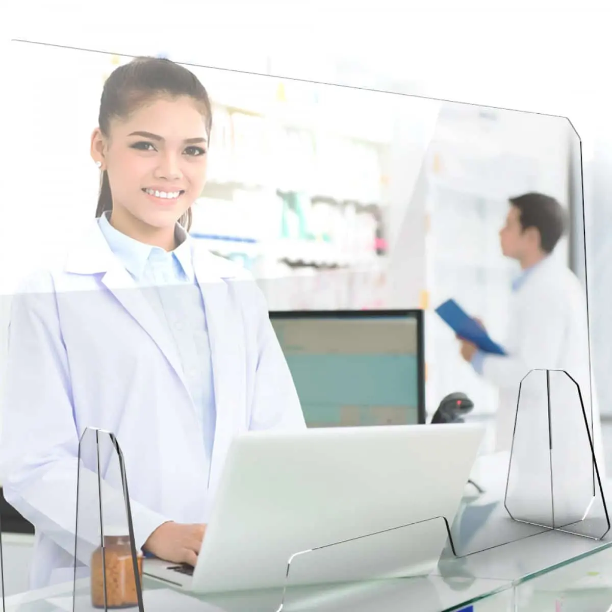 Divisorio anti batterico in plexiglass trasparente, di facile istallazione e rimozione, personalizzabile con scritte e loghi in trasparenza. Ideale per ogni tipo di luogo di lavoro che prevede lo stretto contatto con il pubblico: banche, assicurazioni, negozi etc.