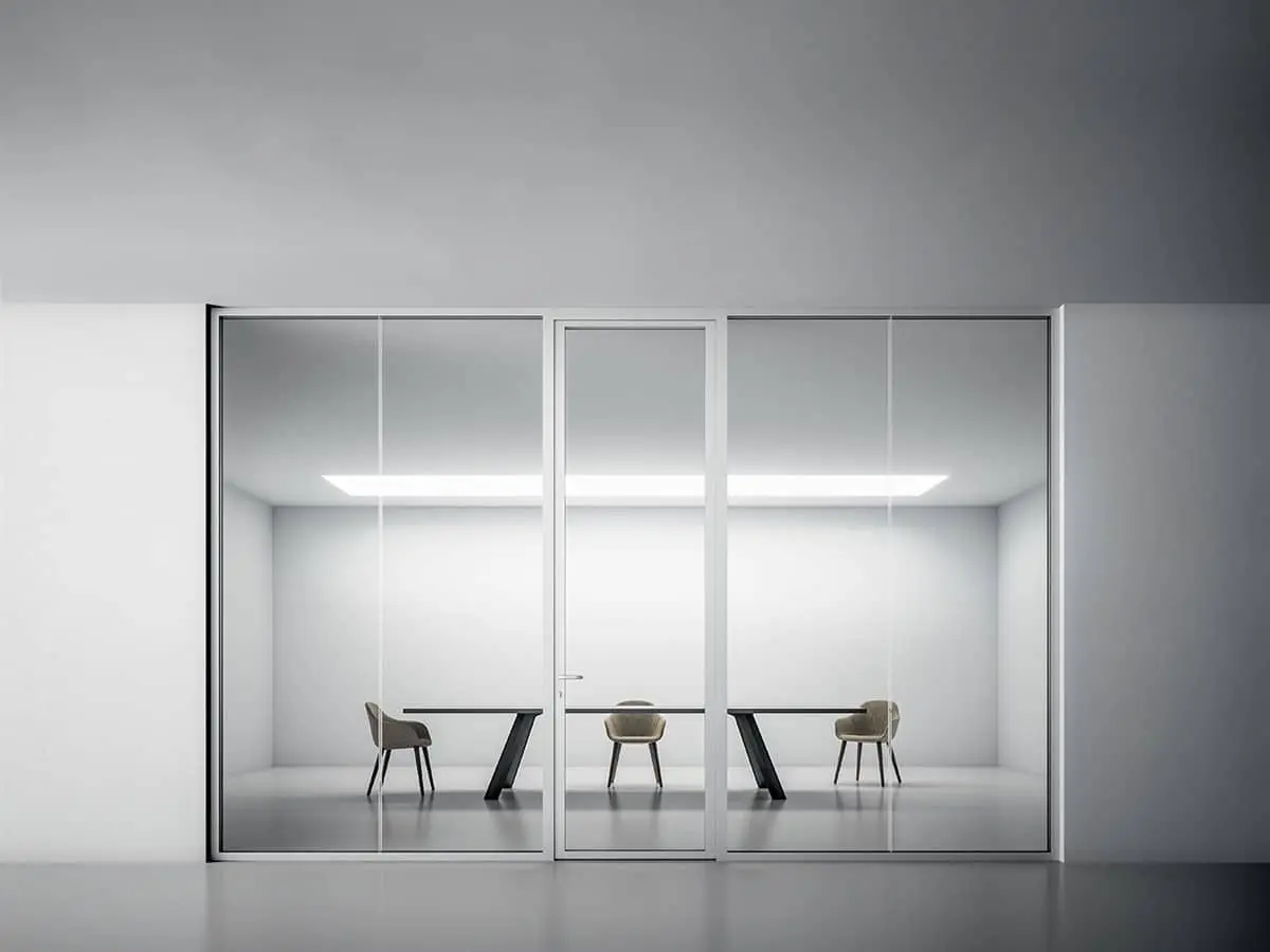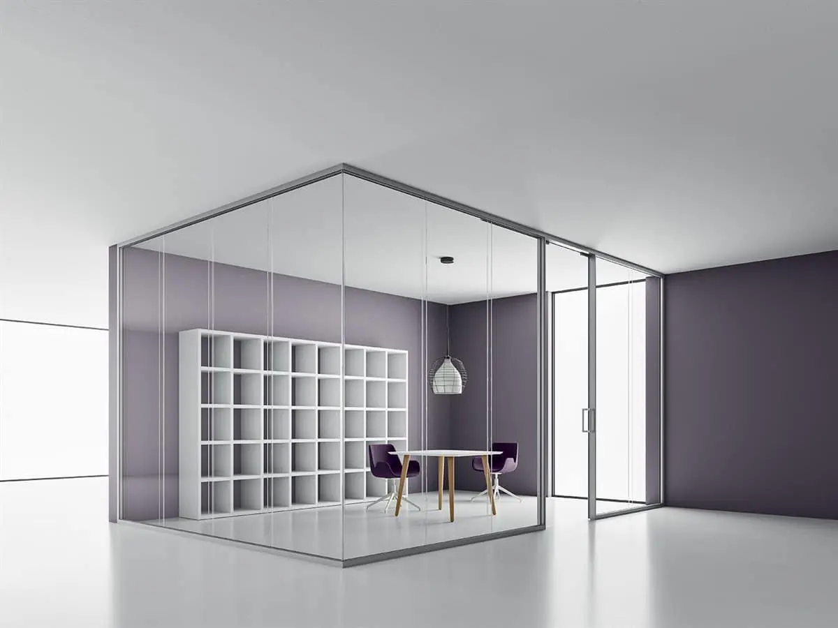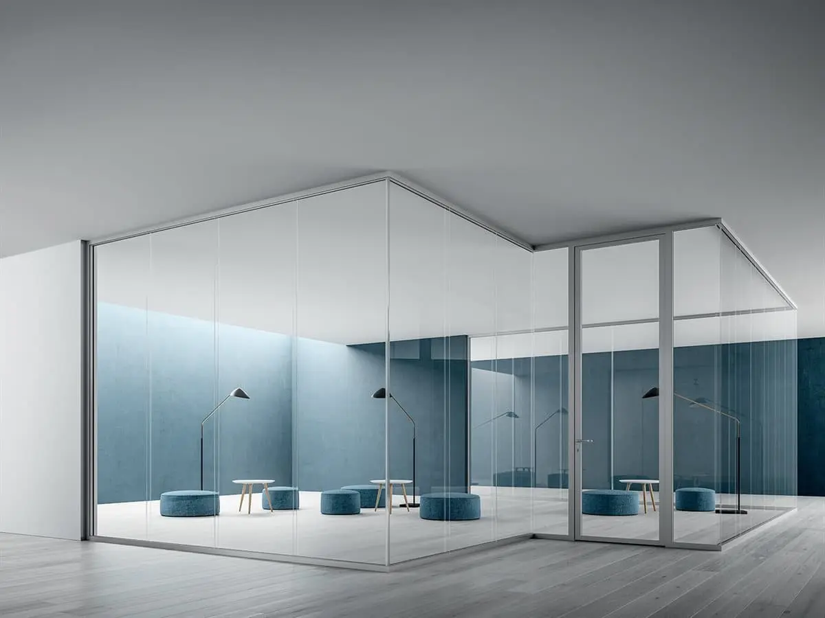 Parete divisoria doppio vetro da 6,4 cm. Gli elementi caratterizzanti sono i profili in alluminio, le lastre di vetro stratificato e i pannelli in melaminico o legno, con porte scorrevoli o battenti. Ideale per la realizzazione di spazi ampi e luminosi.