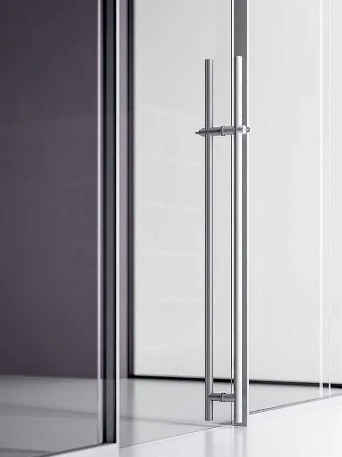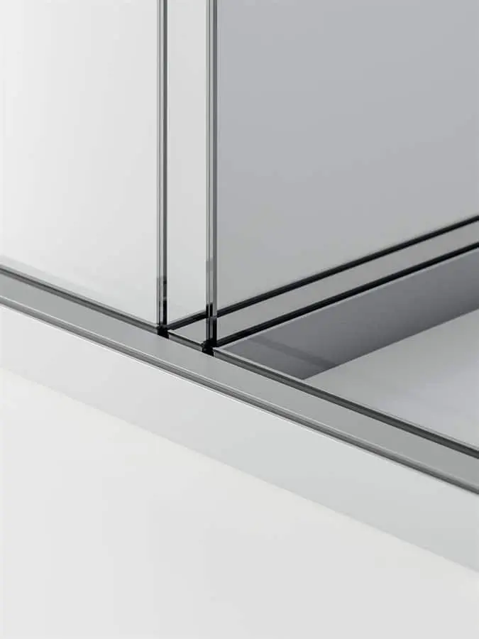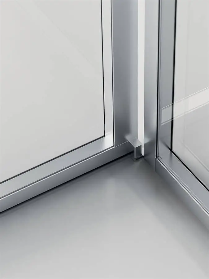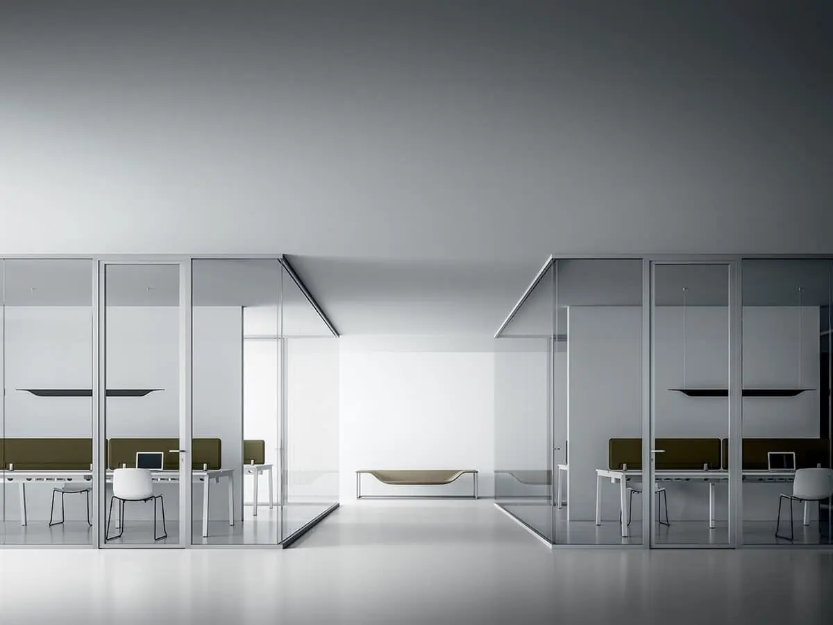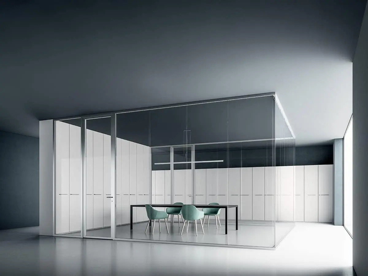 Parete divisoria doppio vetro da 6,4 cm. Gli elementi caratterizzanti sono i profili in alluminio, le lastre di vetro stratificato e i pannelli in melaminico o legno, con porte scorrevoli o battenti. Ideale per la realizzazione di spazi ampi e luminosi.