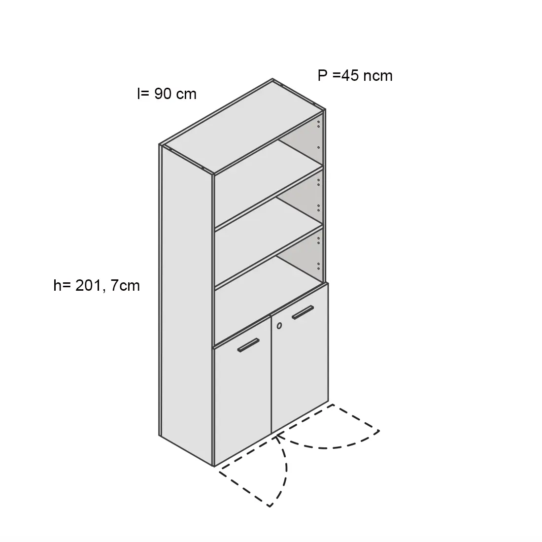 Libreria H200 L90, coppia ante inferiori H80 legno, con serratura, 4 ripiani