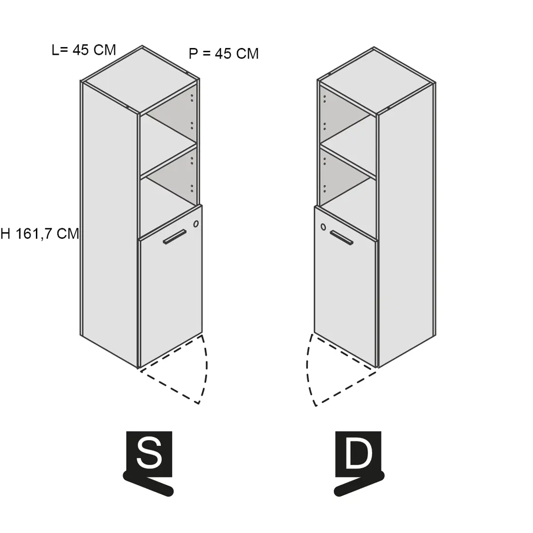 Libreria H160 L45, anta inferiore H80 legno, con serratura, 3 ripiani
