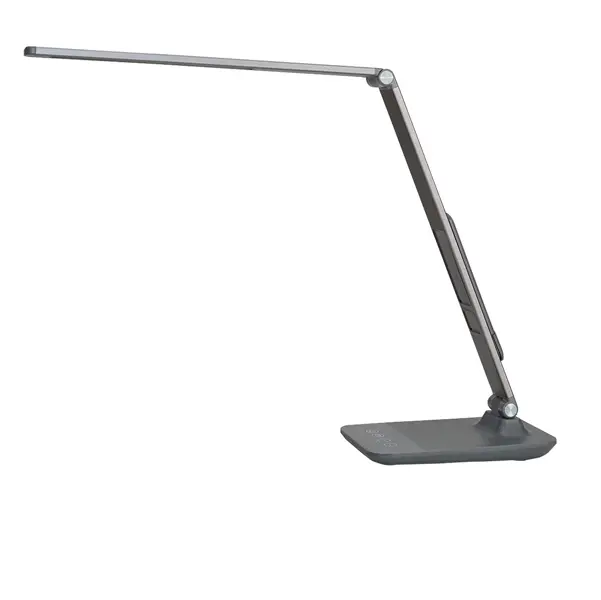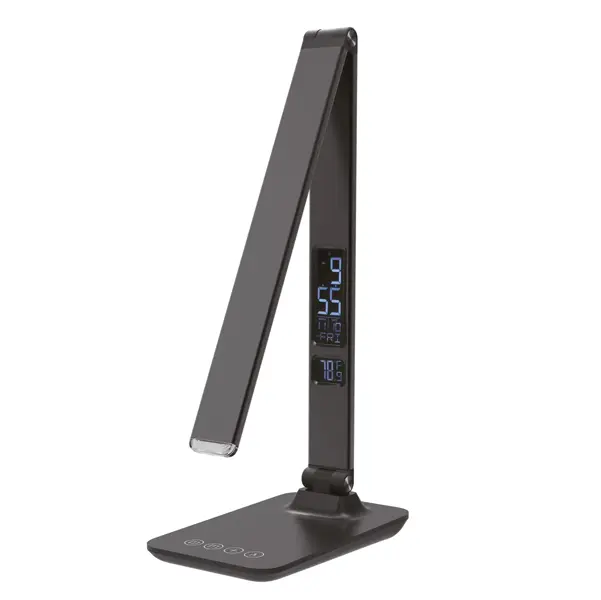 Lampada a LED integrato da 10W con testa e braccio inclinabili, realizzati in alluminio e ABS. Dotata di porta USB per ricaricare dispositivi, display LCD con funzione calendario e termometro. La lampada offre intensità della luce regolabile in 3 colori: bianco, giallo e naturale. L’interruttore On/Off è posizionato sul retro della lampada per una facile accessibilità. La lunghezza del braccio è di 35cm, le dimensioni della testa sono di 32cm e le dimensioni della base sono di 19 x 12cm. La lampada è classificata con classe energetica G