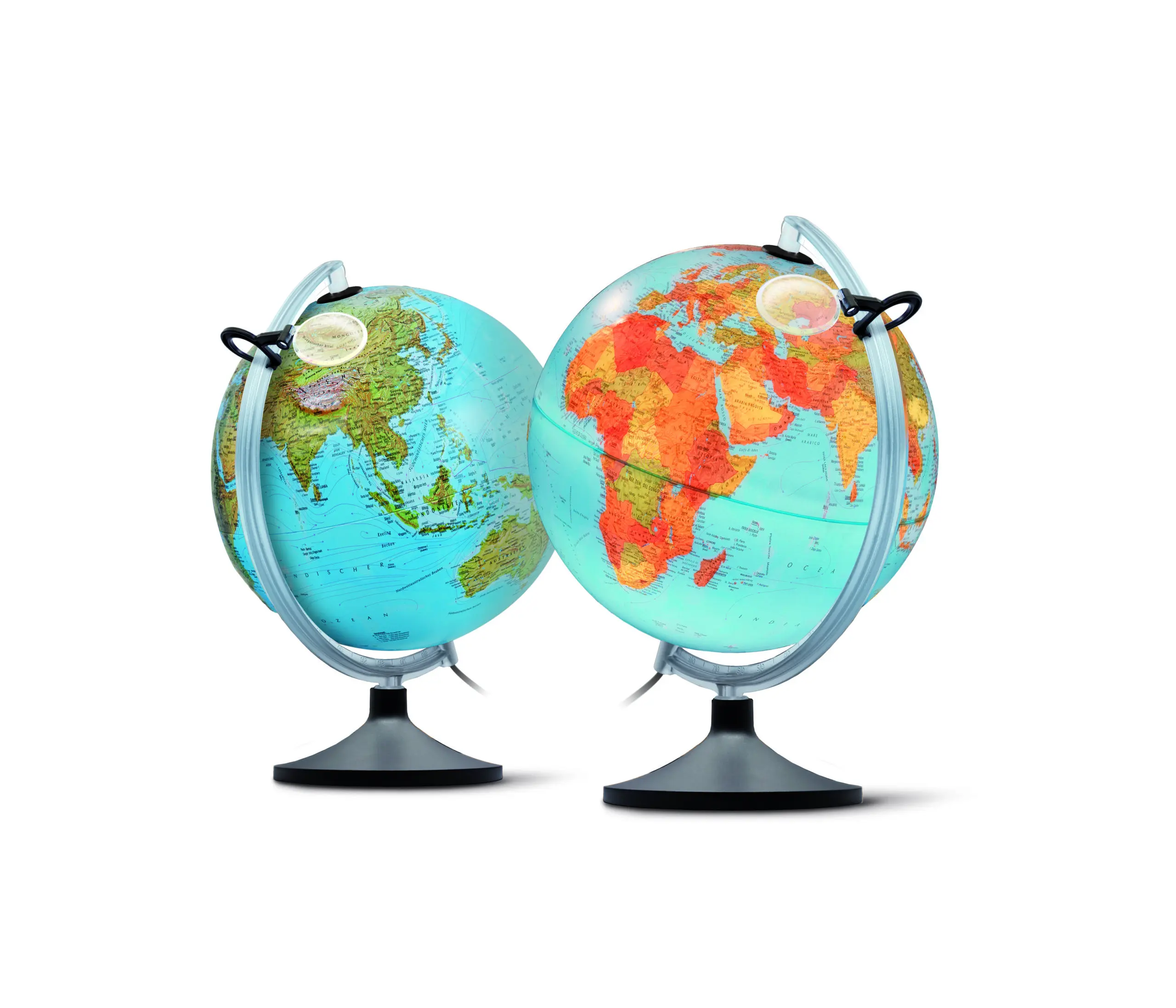 Esplora il mondo con dettagli sorprendenti grazie al Mappamondo Terrestre dotato di una lente di ingrandimento e catene montuose in rilievo. La cartografia fisica si trasforma in politica quando il mappamondo è illuminato, rivelando confini e regioni politiche.