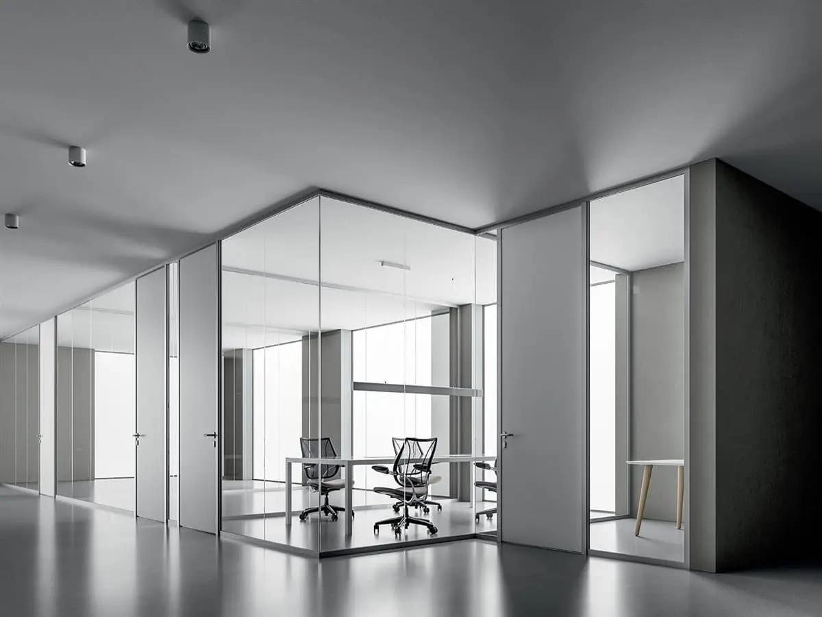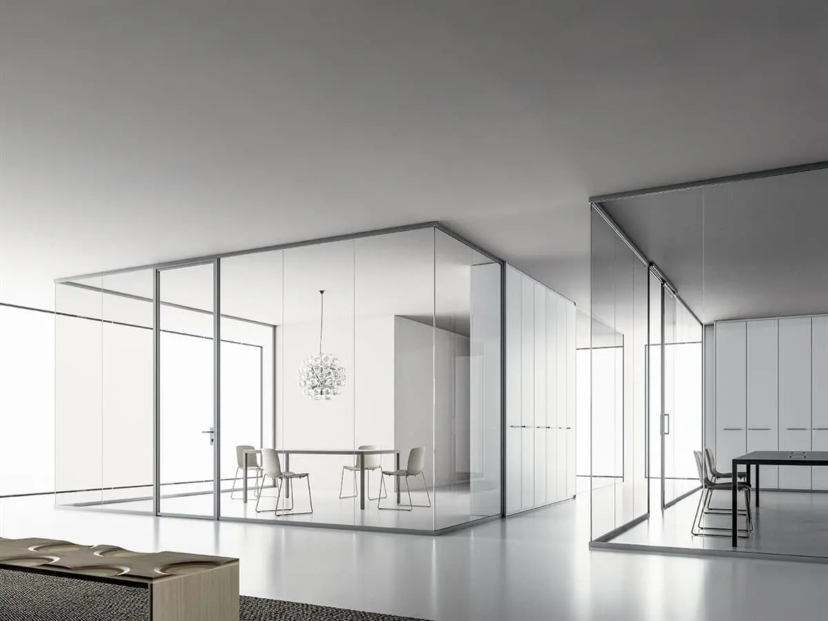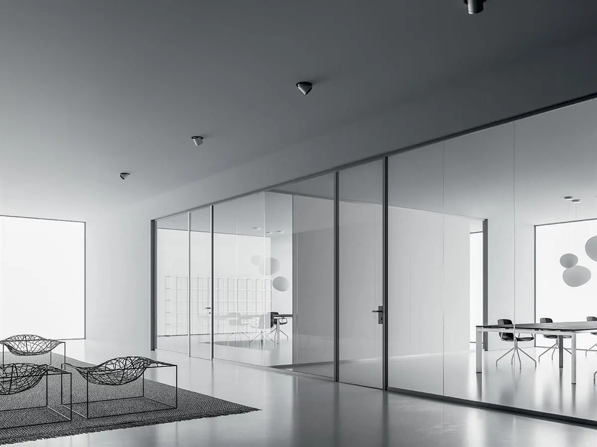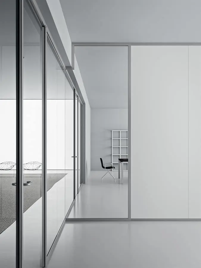 La parete divisoria monovetro da 3,2 cm, evidenzia essenzialità e tecnicità. Gli elementi caratterizzanti sono: profili perimetrali in alluminio, lastre di vetro stratificato, pannelli in melaminico o impiallacciato, porte scorrevoli o battenti e moduli vari. Possibilità di realizzazione anche ad angolo tondo.