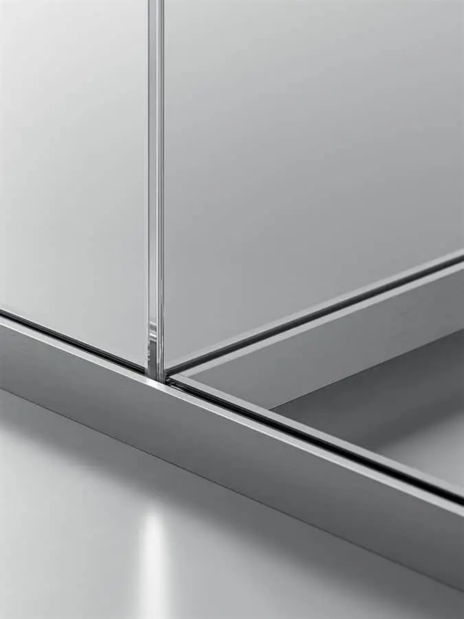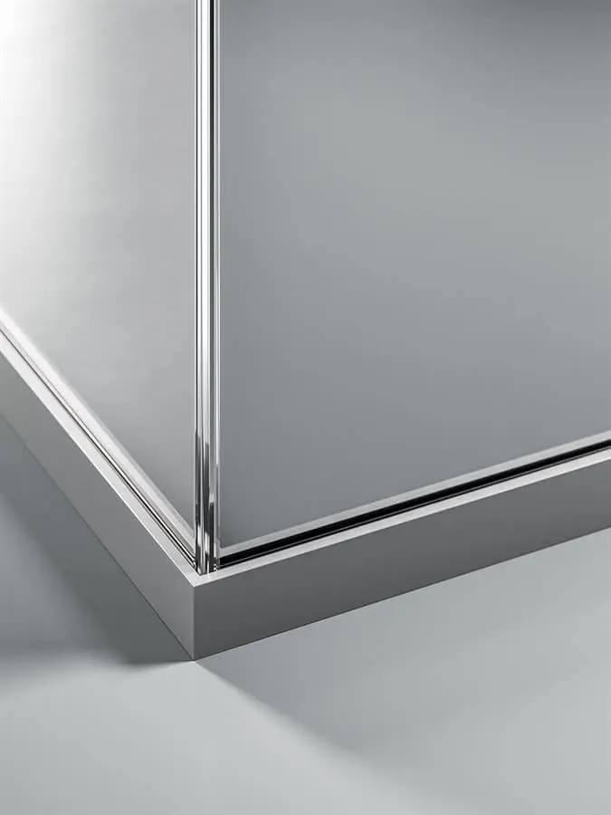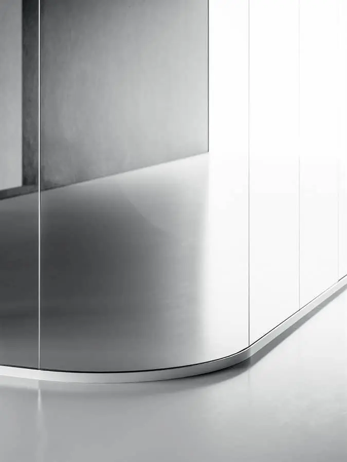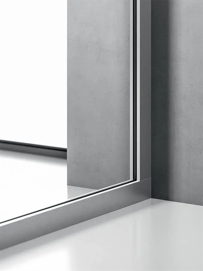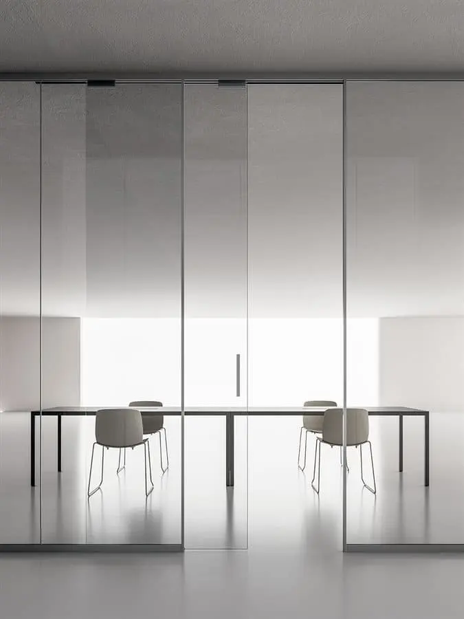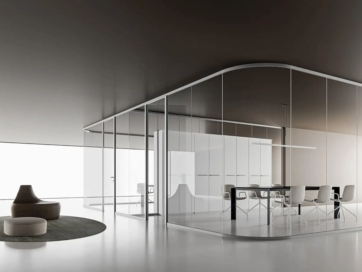 La parete divisoria monovetro da 3,2 cm, evidenzia essenzialità e tecnicità. Gli elementi caratterizzanti sono: profili perimetrali in alluminio, lastre di vetro stratificato, pannelli in melaminico o impiallacciato, porte scorrevoli o battenti e moduli vari. Possibilità di realizzazione anche ad angolo tondo.