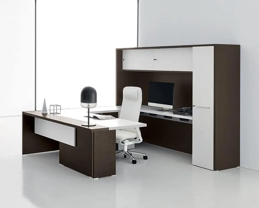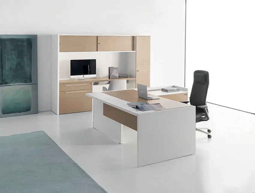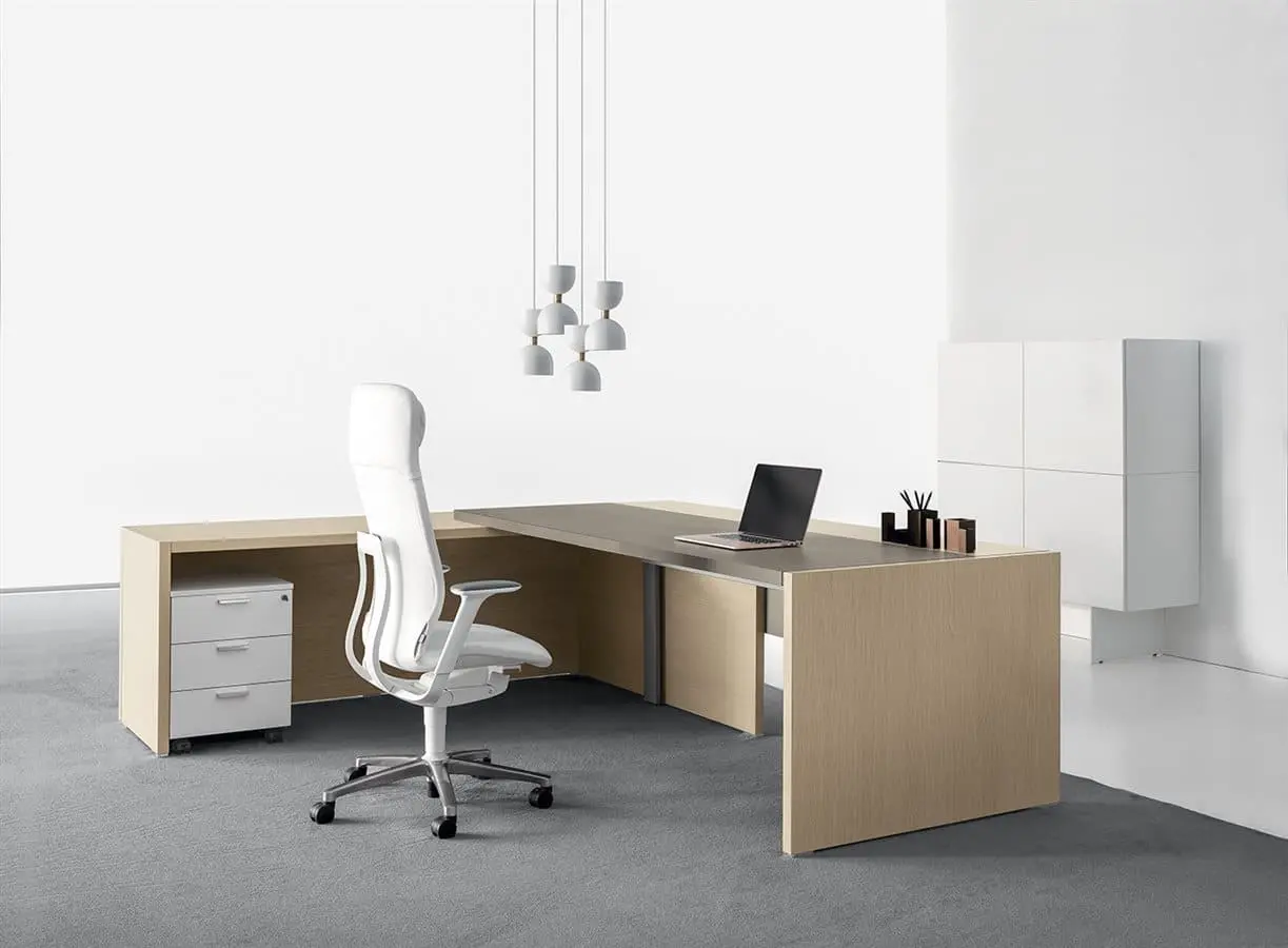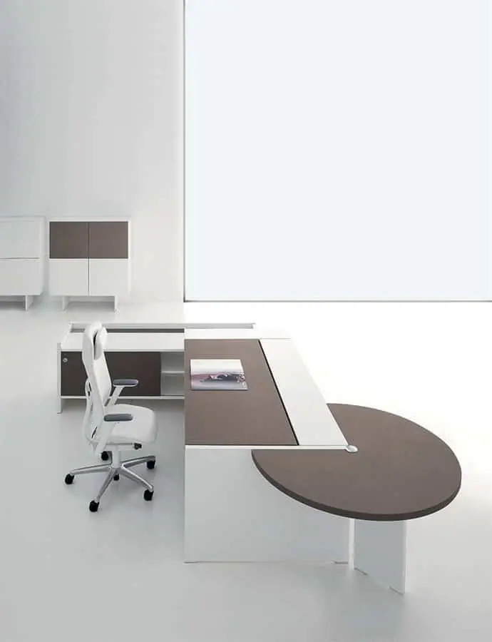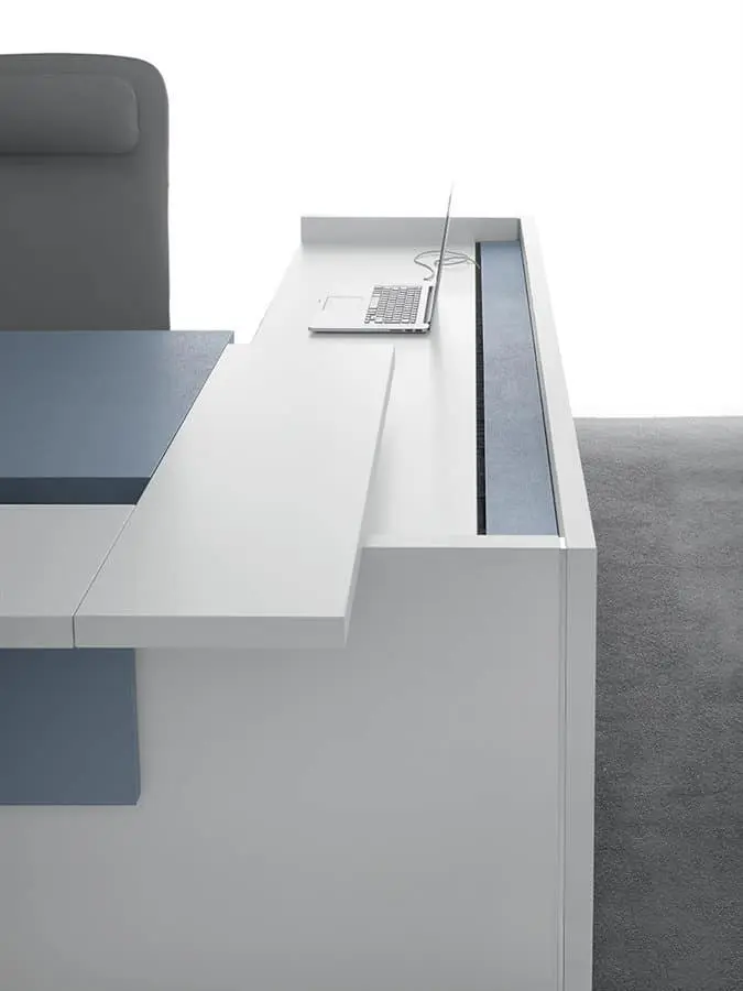 Disponibile con piano di lavoro composto nelle versioni destro o sinistro, o con coppia di gambe terminali. Piano di lavoro e gambe realizzati in conglomerato ligneo sp. 38 mm e modesty panel realizzato in conglomerato ligneo sp. 25 mm, tutti con rivestimento in melaminico bianco, noce “Maroncelli” o rovere chiaro; e bordi perimetrali in ABS sp. 1,5 mm.