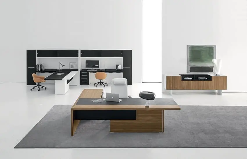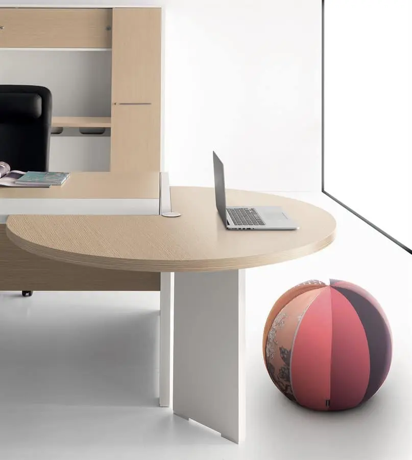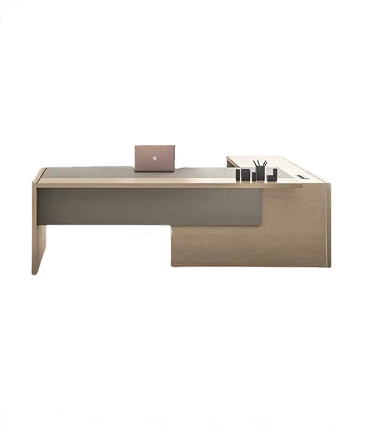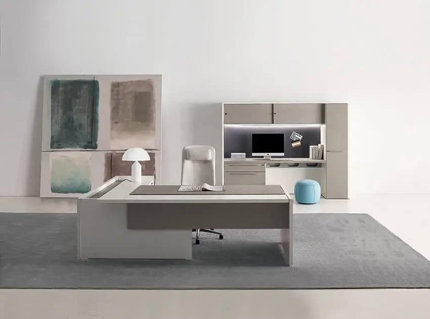 Disponibile con piano di lavoro composto nelle versioni destro o sinistro, o con coppia di gambe terminali. Piano di lavoro e gambe realizzati in conglomerato ligneo sp. 38 mm e modesty panel realizzato in conglomerato ligneo sp. 25 mm, tutti con rivestimento in melaminico bianco, noce “Maroncelli” o rovere chiaro; e bordi perimetrali in ABS sp. 1,5 mm.