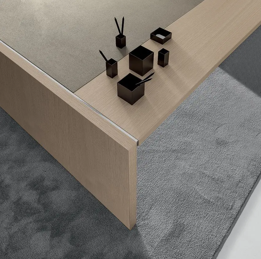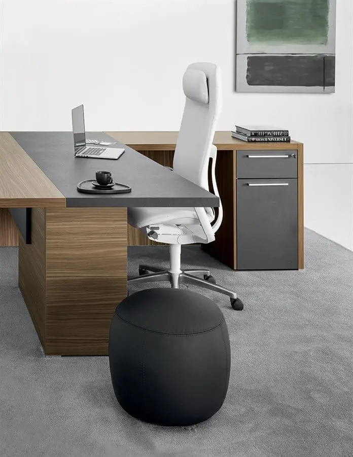 Il piano di lavoro lato operatore e il modesty panel sono disponibili anche in melaminico con finitura effetto pelle nelle colorazioni arena, caffè, jasmine e nero e bordi perimetrali effetto pelle in ABS sp. 1 mm in tinta.