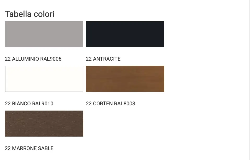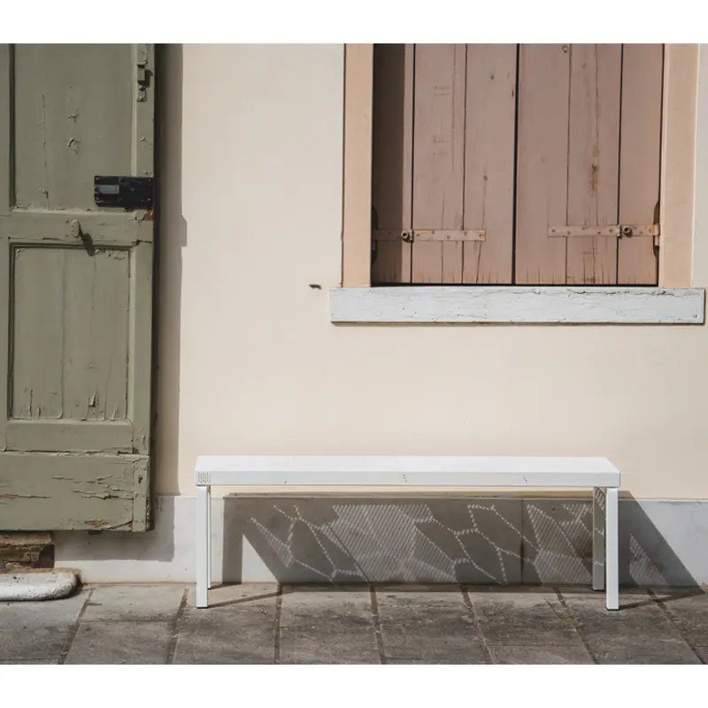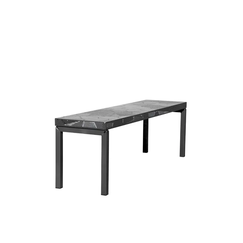 Panca realizzata in lamina metallica punzonata, zincata e verniciata a polveri termoindurenti. Disponibile nei colori alluminio, antracite, bianco, corten o marrone sable.