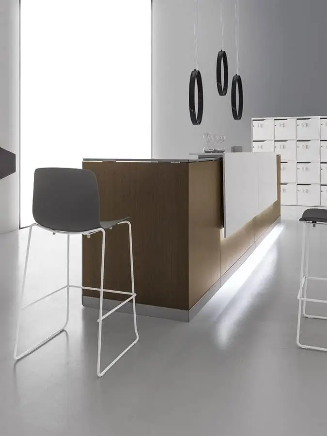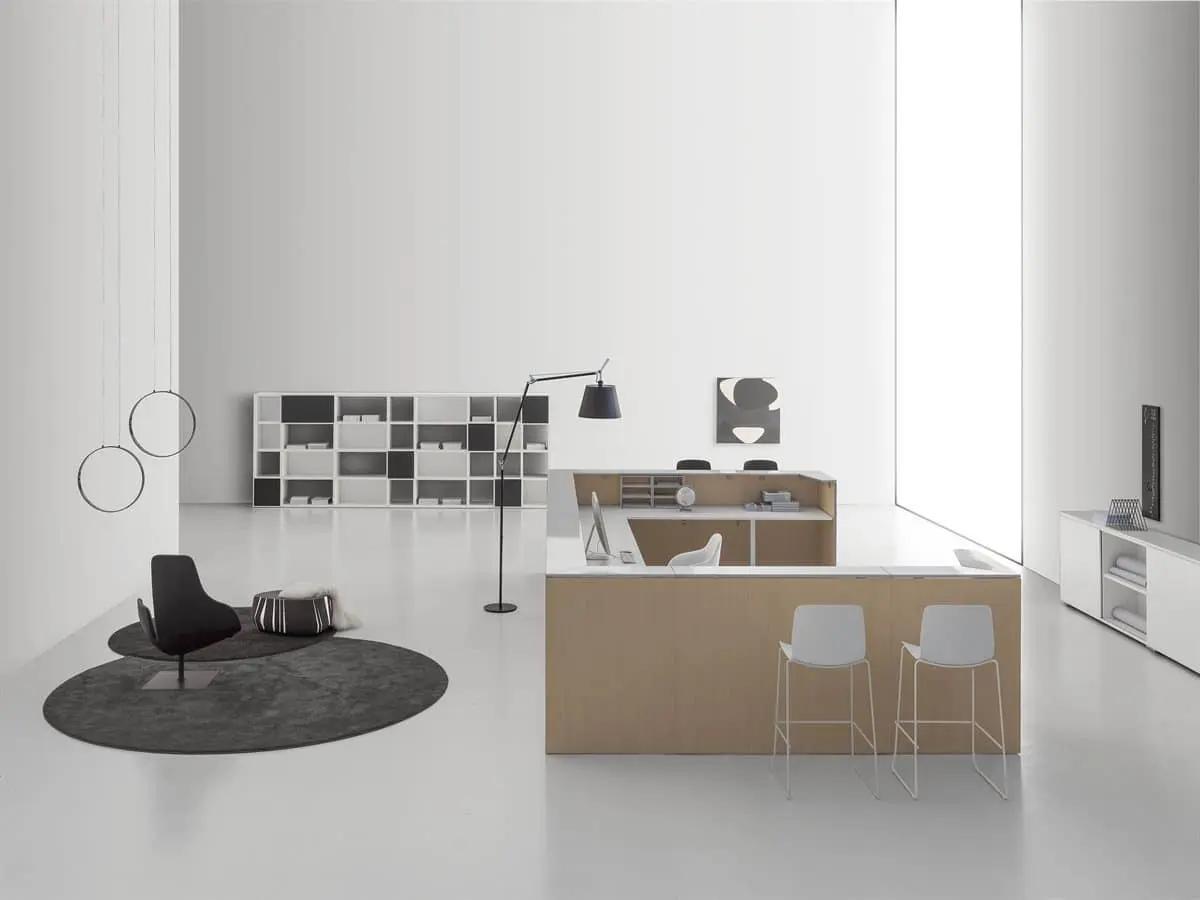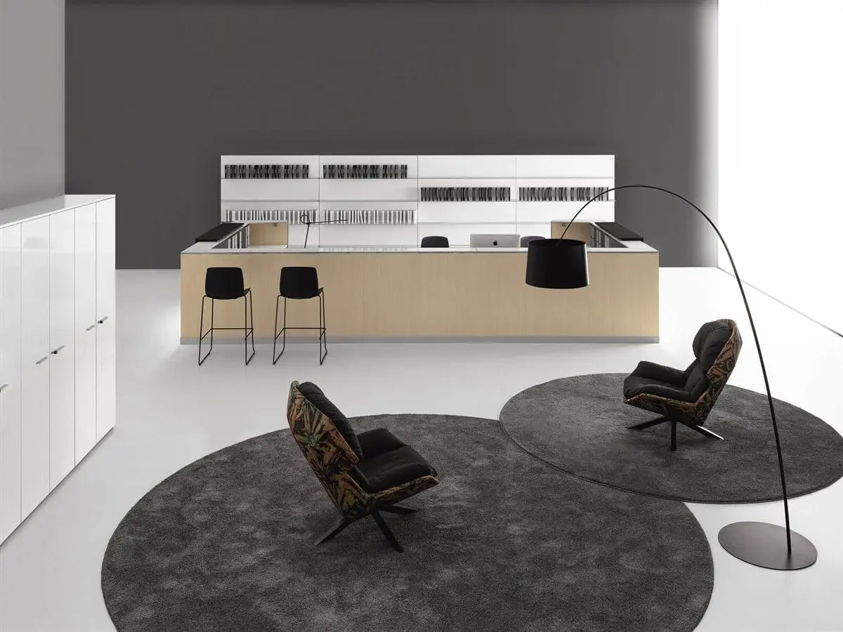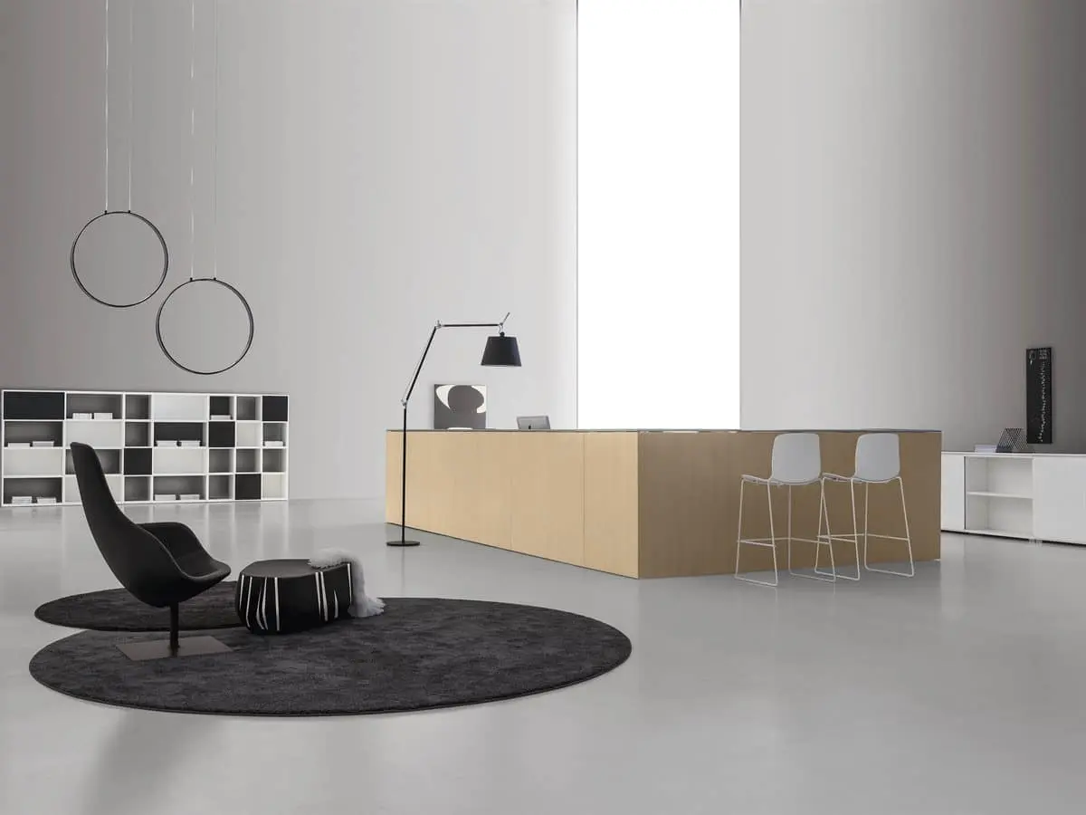 Minimalismo e pulizia progettuale. La collezione si presenta come elemento dedicato all’accoglienza. I banconi da reception per ufficio sono caratterizzati da elementi semplici che, accostati tra di loro, definiscono lo spazio di primo contatto. Conferiscono alla reception un’immagine fresca e dinamica. Cinque tipologie di moduli consentono di ottenere composizioni in grado di soddisfare qualsiasi esigenza funzionale.