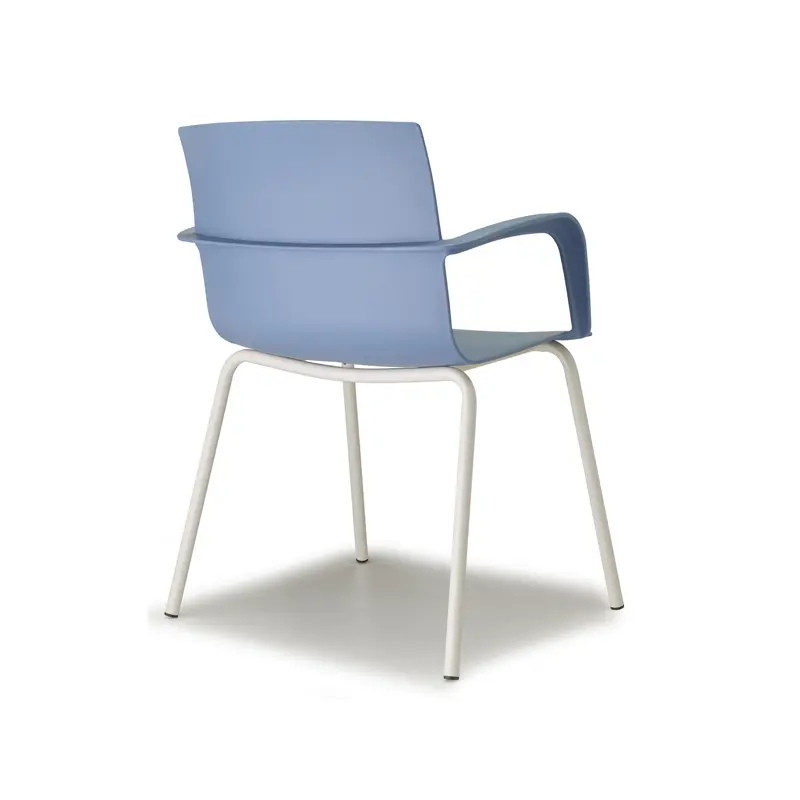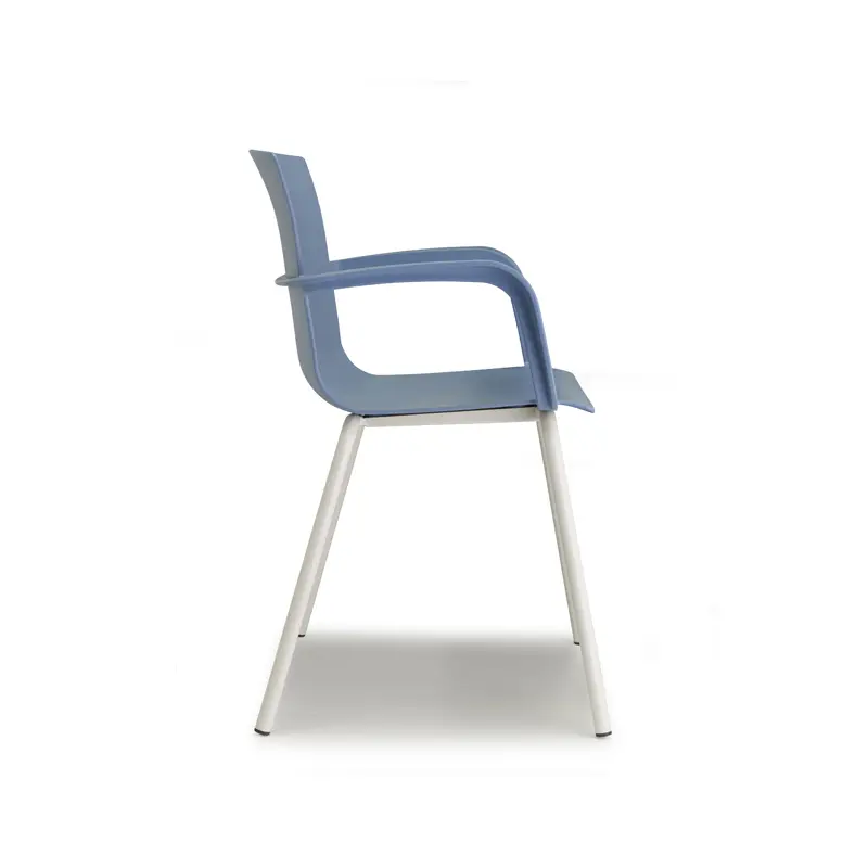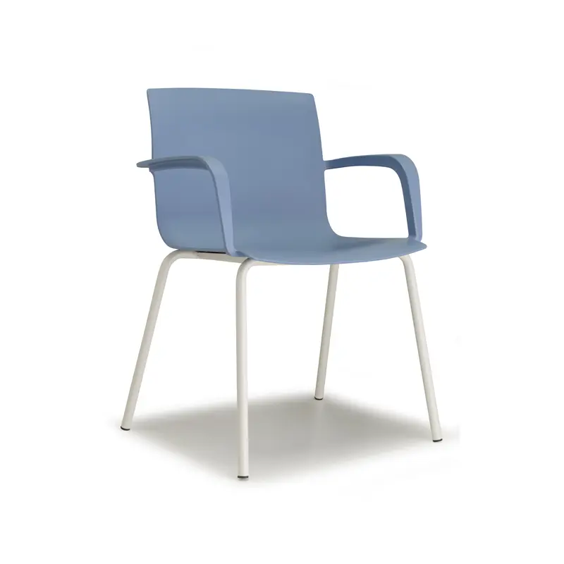 Seduta con braccioli realizzata in materiale plastico resistente, disponibile nei colori rosso, grigio, avorio, giallo o azzurro.