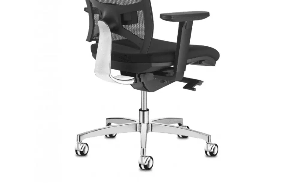 1. Schienale in rete autoportante: struttura in poliammide e fibra di vetro, offre supporto ergonomico e ventilazione.